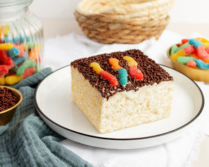 Playful, chewy, and a little mischievous — our Worms in Dirt Crispy Treat is pure fun in dessert form. A gooey marshmallow-crisped rice base gets topped with a “dirt” layer of rich chocolate sprinkles, then finished off with colorful sour gummy worms wriggling on top. It’s sweet, tangy, crunchy, and chewy all at once — the ultimate party treat for kids (and kids at heart).