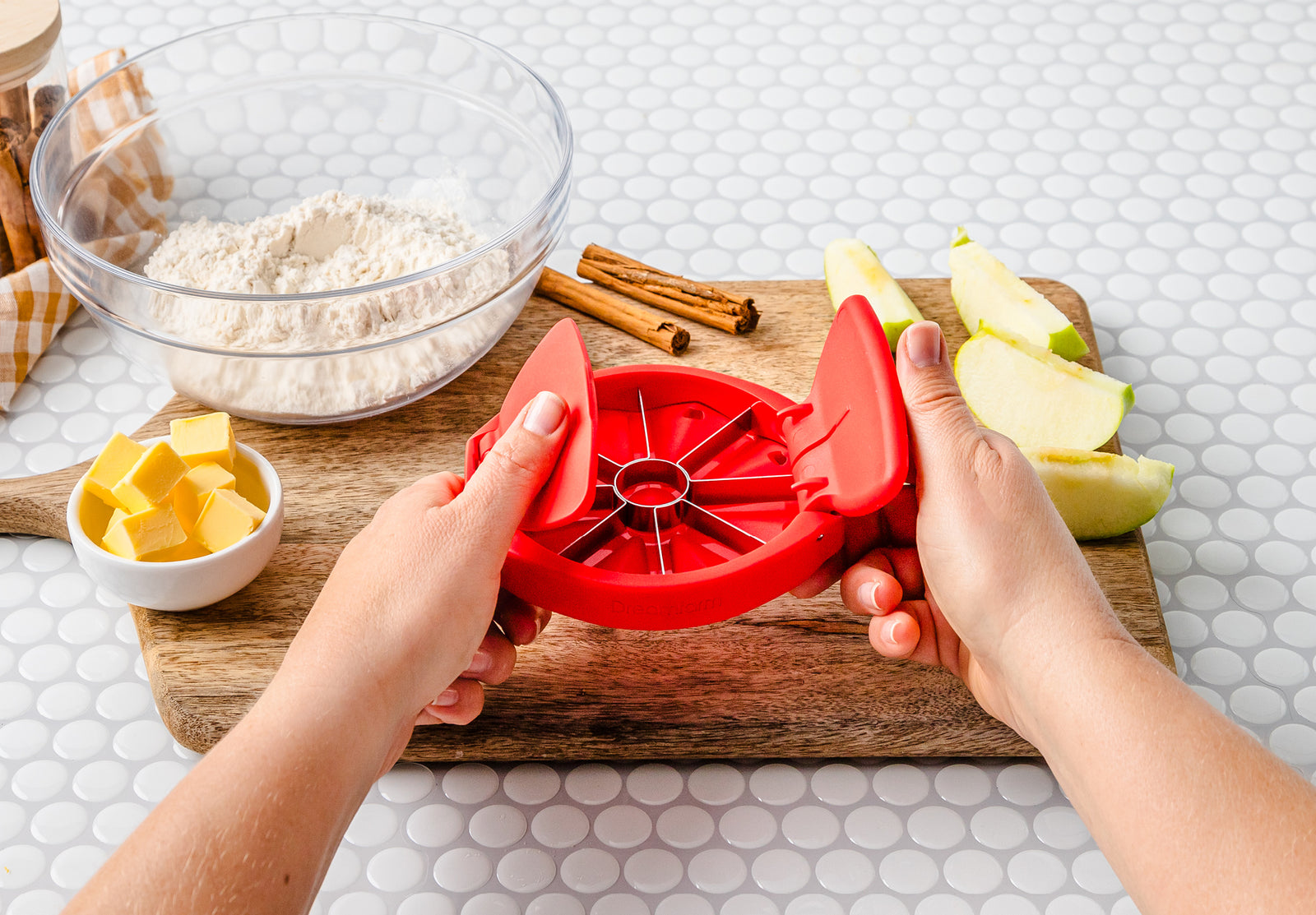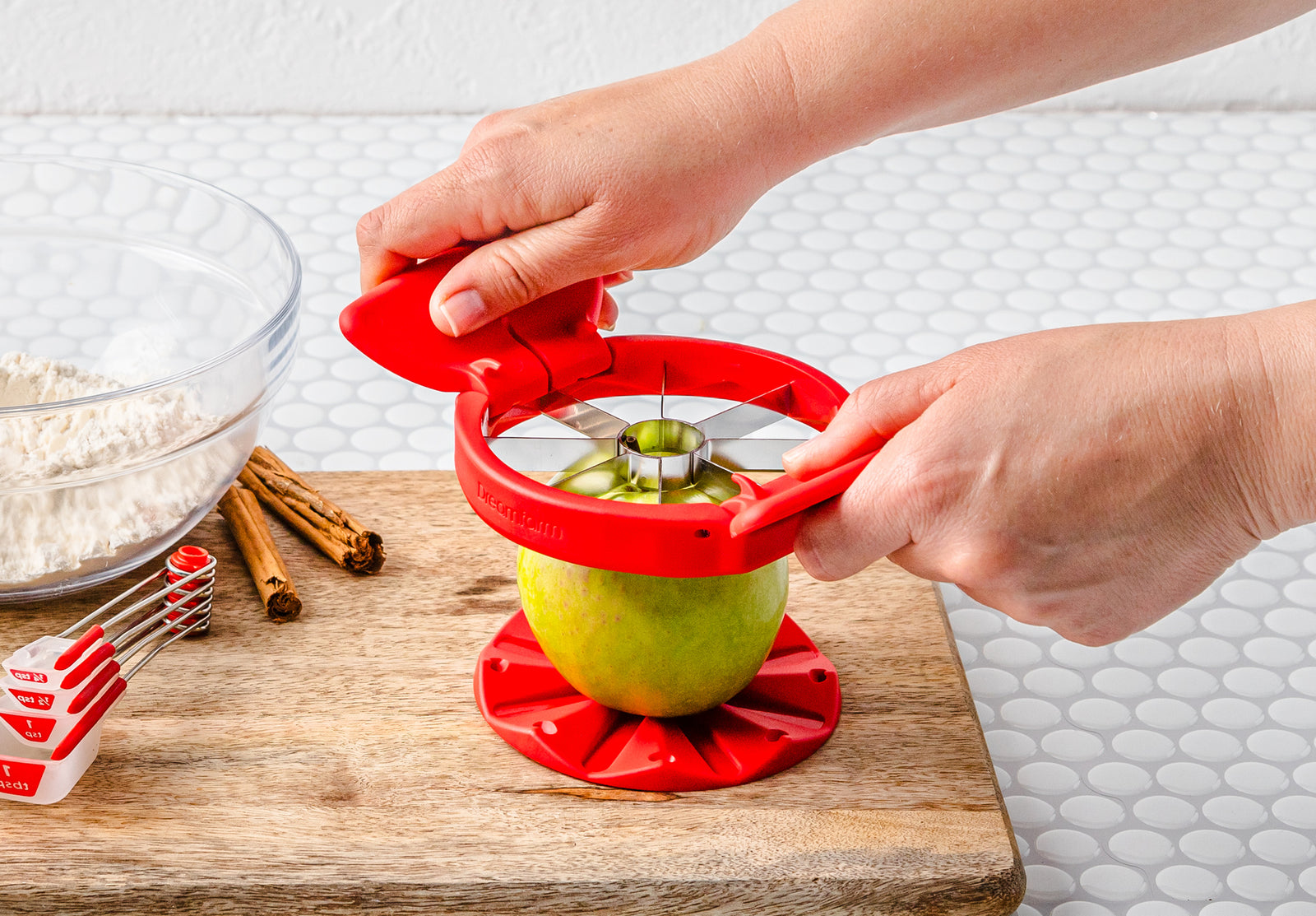 Wide diameter cutter divides all sizes of apples into 8 equal pieces and removes their core.