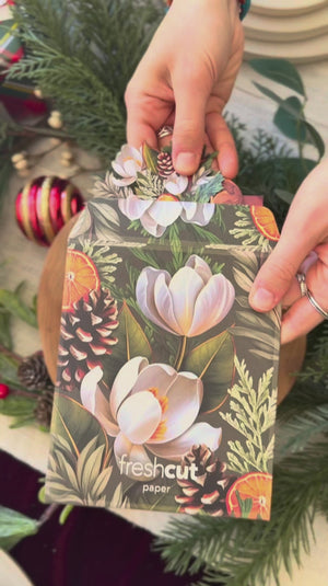 Send a little winter magic that pops ✨ The Mini Winter Magnolia Pop-Up Card by Freshcut Paper opens into a charming 3D arrangement of snowy-white magnolia blooms, evergreen sprigs, pinecones, and bright citrus slices—like a cozy holiday centerpiece you can mail. Perfect for seasonal hellos, thank-yous, and “thinking of you” notes when a flat card just won’t do.