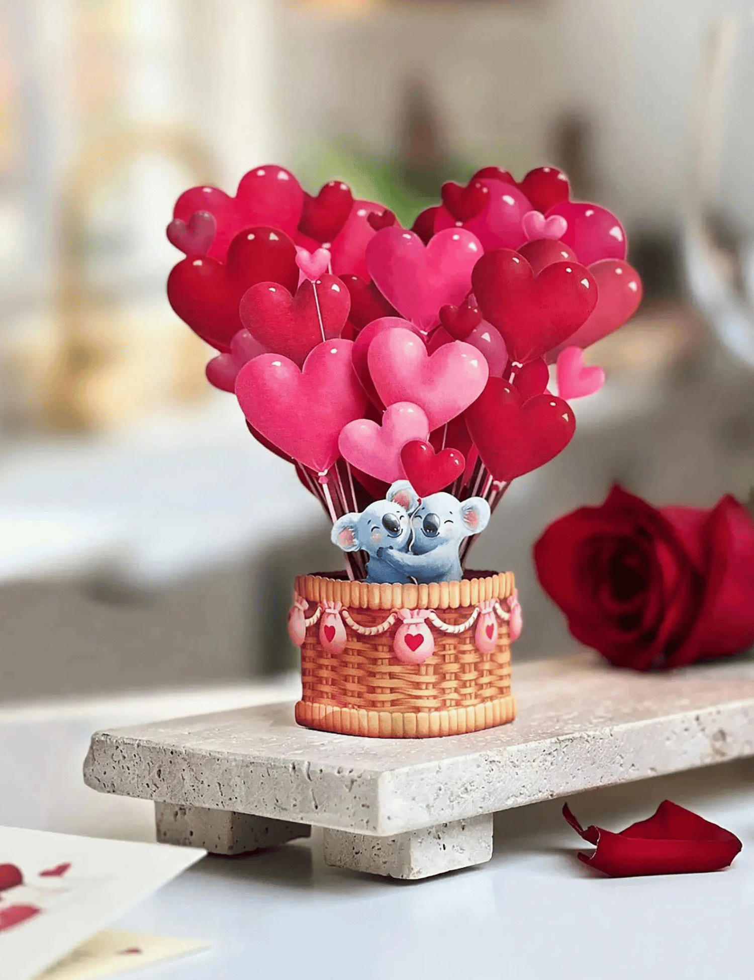 Mini 3D pop-up heart balloons scene with koala basket detail