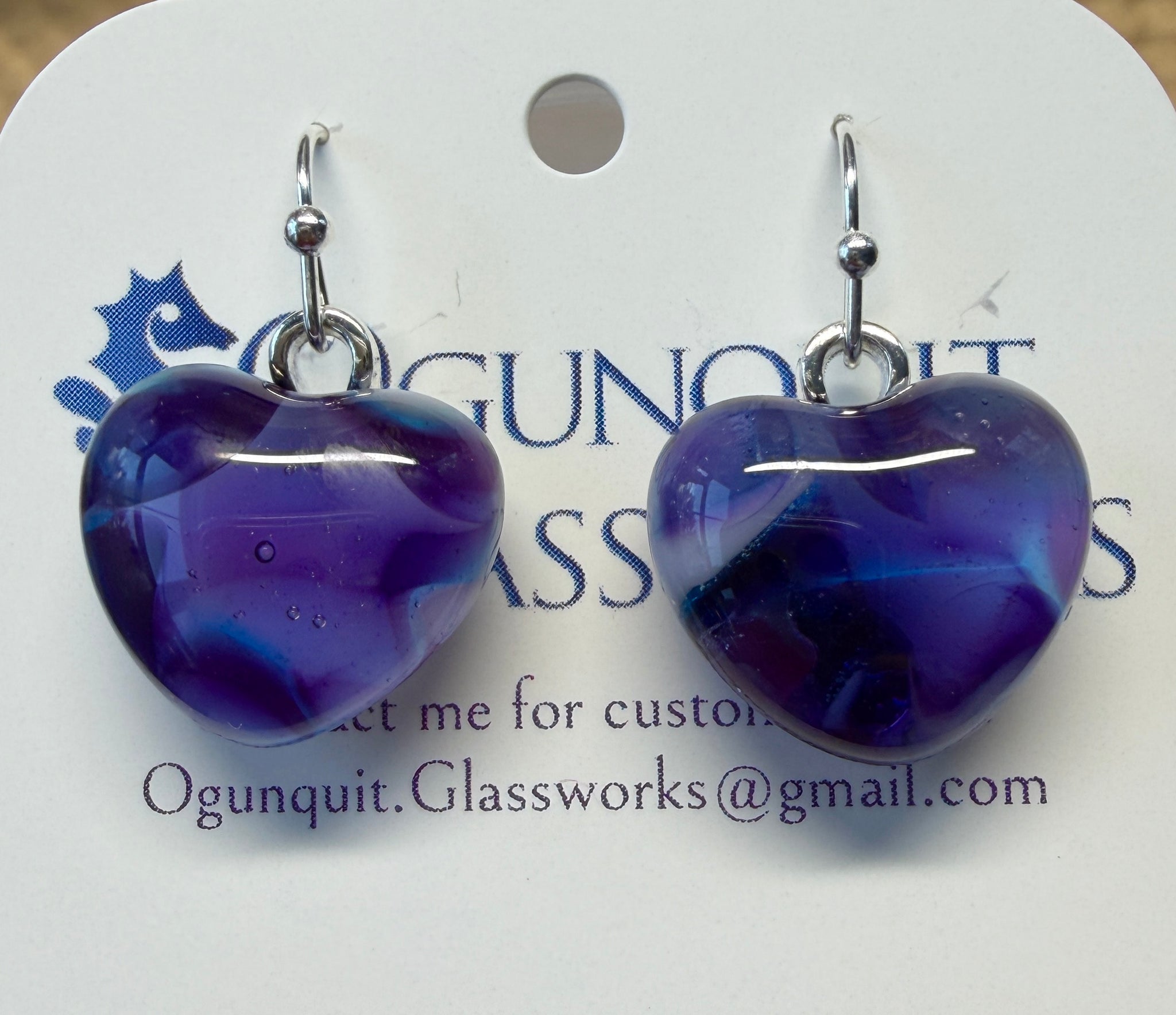 Float into a dreamy, midnight-meets-neon vibe with these Purple Haze Glass Heart Drop Earrings by Ogunquit Glassworks. Each glossy heart shimmers with deep violet tones and electric blue waves, like twilight over the ocean—moody, mesmerizing, and totally wearable. Finished with sleek silver-tone hooks, they’re the perfect little statement for anyone who loves bold color with an artsy twist.