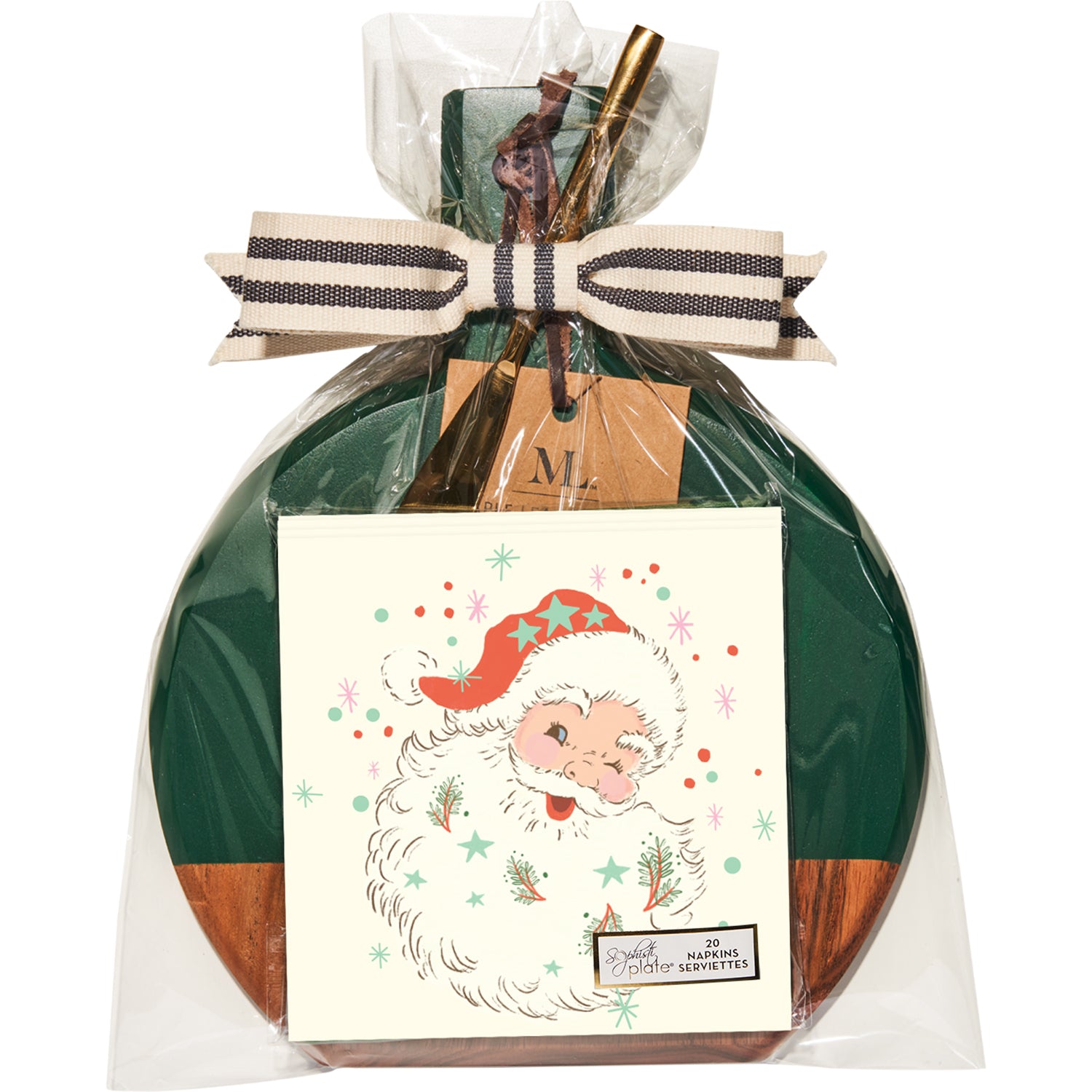 Make spirits bright—and snacks even brighter—with the Vintage Santa Acacia Bevel Board and Gold Spreader. This gift-ready set pairs a rich acacia wood bevel board with a sleek gold spreader for effortless holiday hosting. Tucked inside is a pack of Vintage Santa napkins featuring the cutest retro-style Santa, adding instant nostalgia to your cheese nights, cookie swaps, and Christmas cocktail hours.