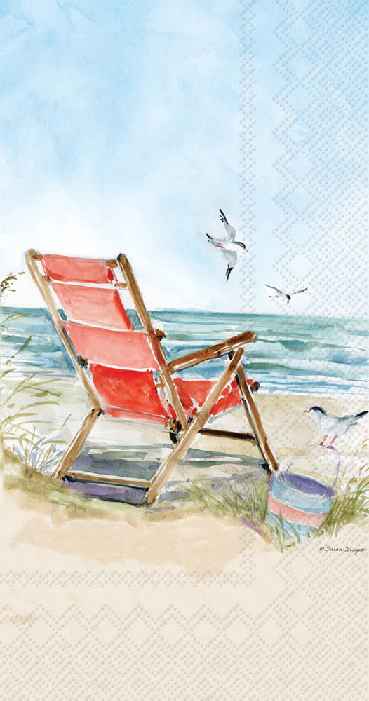 Bring relaxed coastal charm to your table with these Beach Chairs Guest Towels. This breezy watercolor design captures the simple joy of a quiet day by the sea—featuring a classic red beach chair set along the shoreline, gentle waves rolling in, and seagulls gliding through the salty air. Soft sandy tones and tranquil blues create a peaceful seaside scene that instantly evokes the feeling of warm sun, ocean breezes, and carefree summer afternoons.