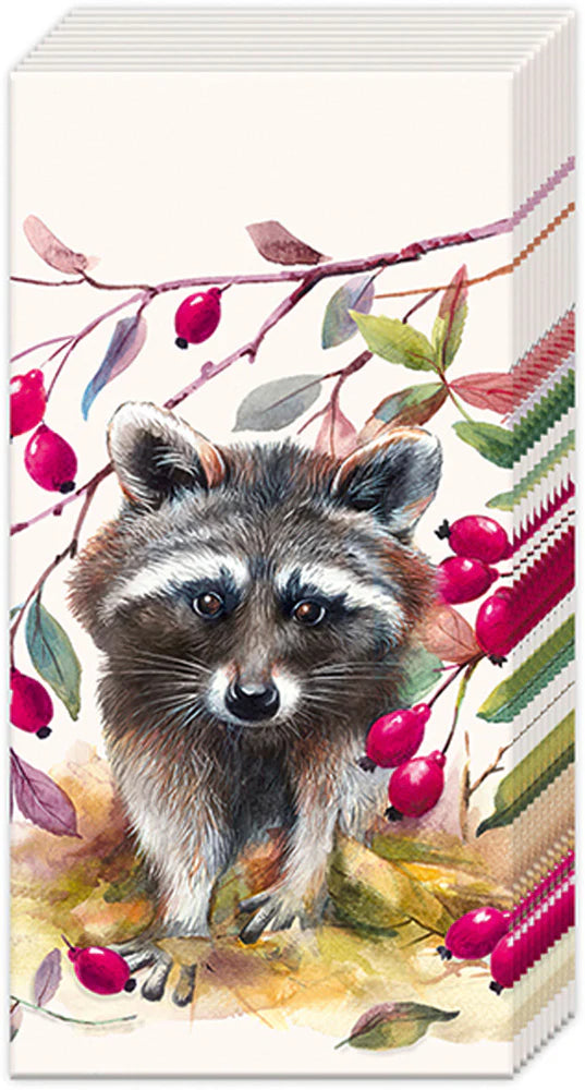 Meet your sneaky sidekick for sniffles and surprises — the adorable Bandit Pocket Tissues! Featuring a charming watercolor raccoon peeking out from a tangle of bright berries and autumn leaves, these tissues are as delightful as they are practical.