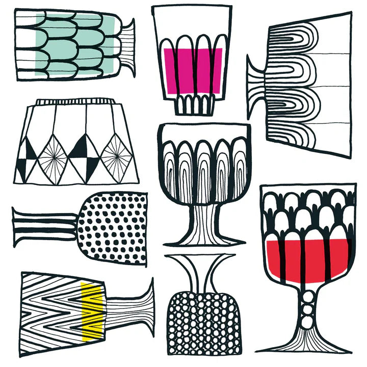 Make every toast a little more fabulous with these striking Kippis Cocktail Napkins! Featuring a playful array of retro-modern glassware in bold black linework and pops of vibrant color, this Finnish-inspired design turns cocktail hour into a design statement.