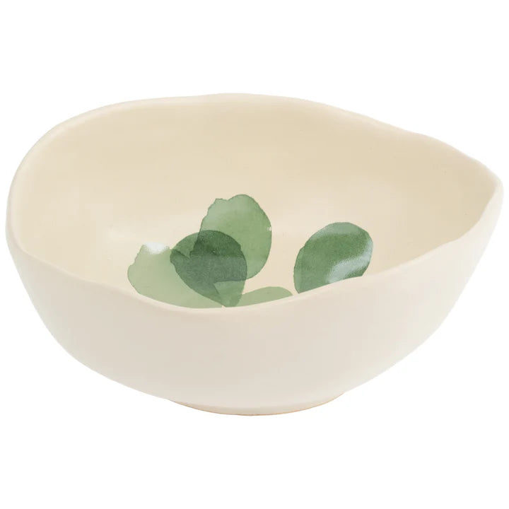 Delicate, organic, and effortlessly beautiful, the Leaf and Stem Small Bowl brings a breath of fresh air to your table. With its softly scalloped rim and gentle watercolor leaf motif nestled inside, this bowl is perfect for serving dips, snacks, berries, or even your favorite scoop of sorbet.