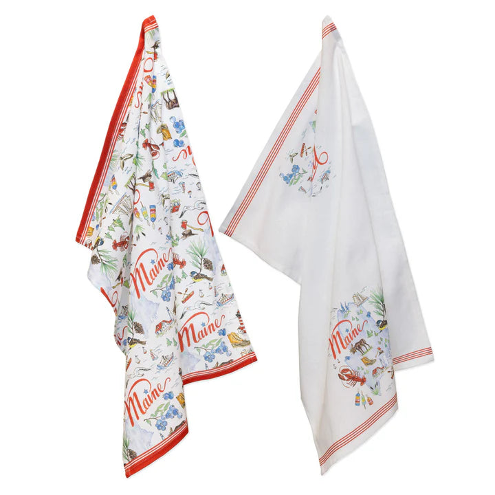 Bring a splash of New England charm to your kitchen with this Set of 2 Maine Tea Towels—a delightful duo that celebrates the spirit and sights of the Pine Tree State!
