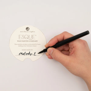 Esque® is Northern Lights' longest-selling product line and features an exclusive, handmade technique called wax painting. Layers of wax and metallic swirls encircle the inside of clear glass causing a striking glow to emanate with varying intensity and detail when lit. This beloved product line is newly reimagined as a wax painted luminary and candle insert for a reusable art piece.