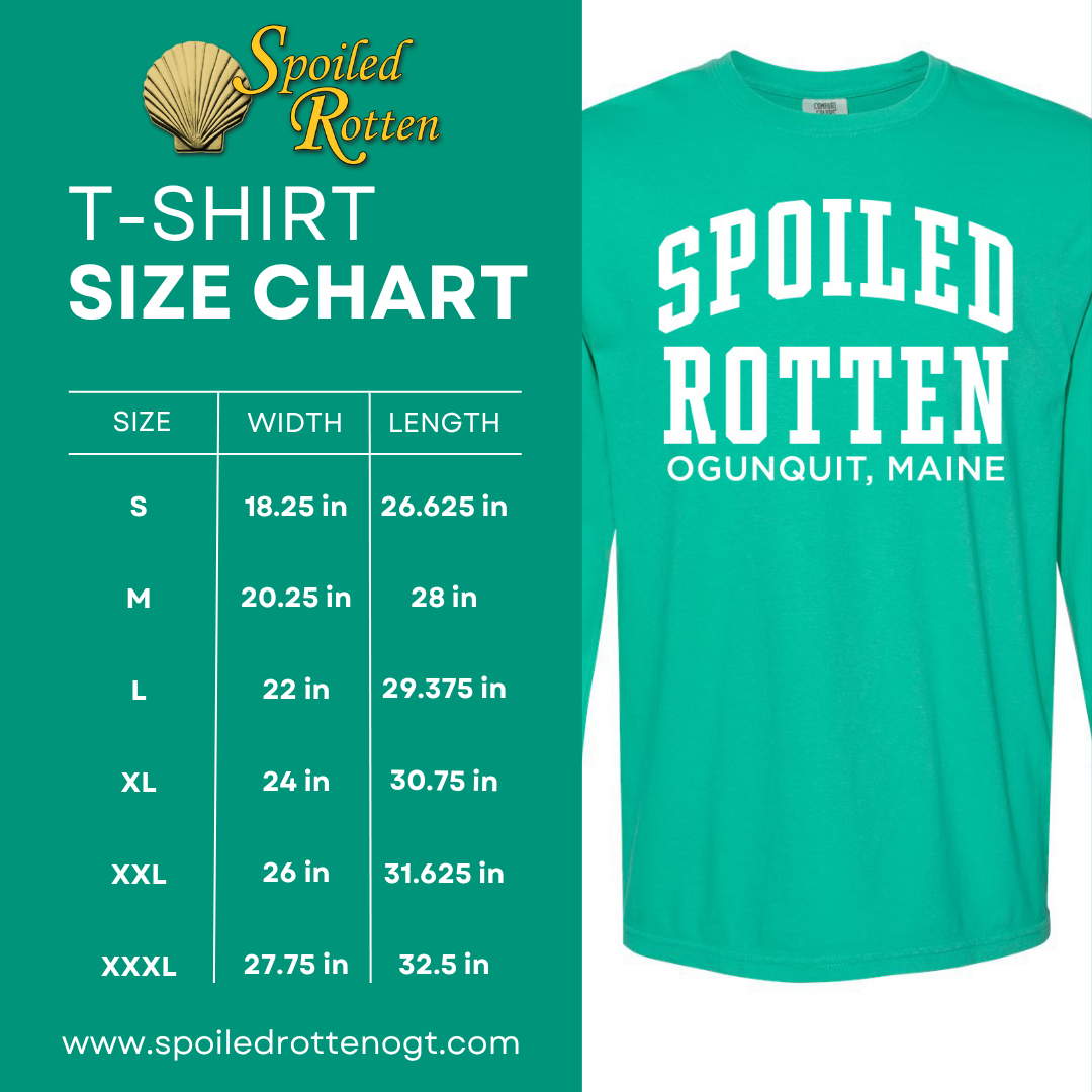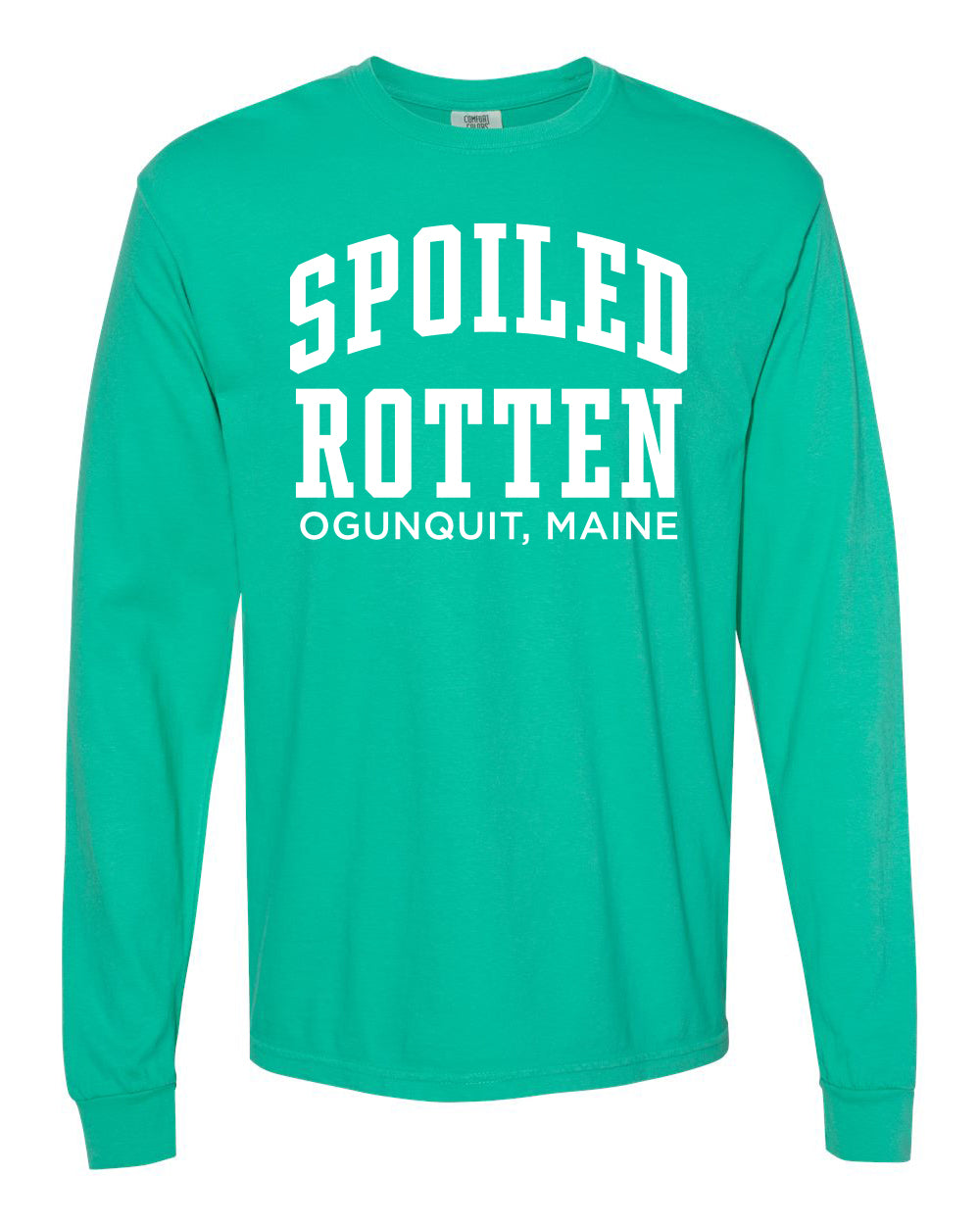 Get cozy and playful with the Spoiled Rotten Island Green Long Sleeve Tee — a must-have from your favorite Ogunquit, Maine shop! This vibrant, tropical green shirt proudly declares “SPOILED ROTTEN” on the front and cheekily teases “SPOIL ME” across the back, letting everyone know you’re here for the good vibes and a little pampering.
